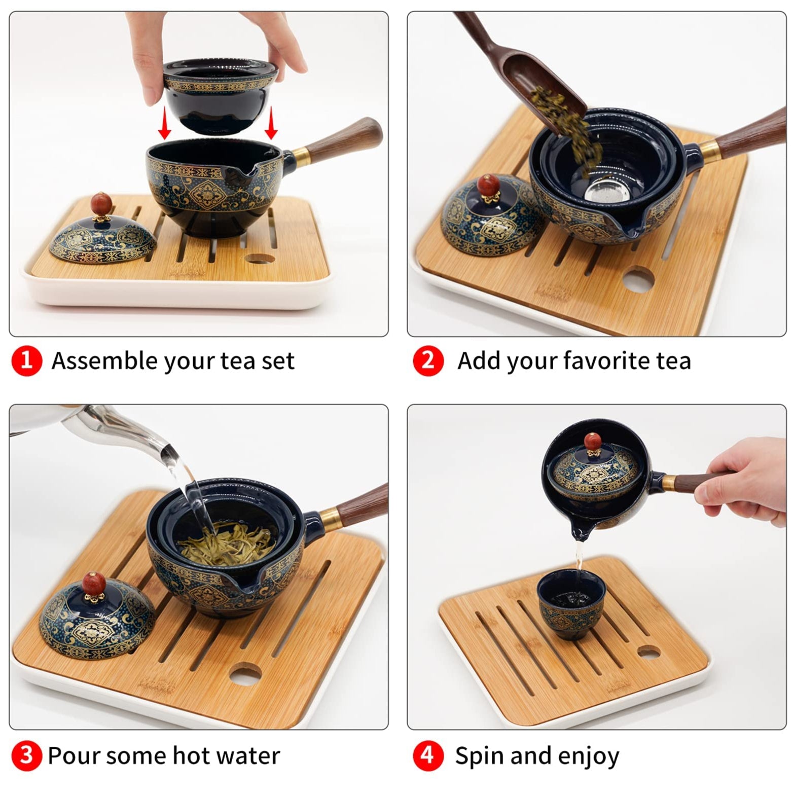 • Rotatable Teapot, 4 Teacups, Tea Tray and Travel Bag